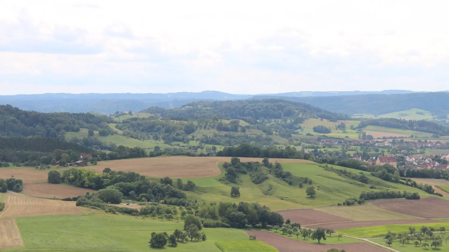 Blick vom Einkorn in Richtung Michelbach. Die Deutsche Funkturm GmbH möchte den Mobilfunkmast nahe des Weilers Hagenhof (Häuser am linken Bildrand) errichten. Rechts ist ein Teil des Hauptortes mit dem charakteristischen Gebäude des Schulzentrums zu sehen. ⇥