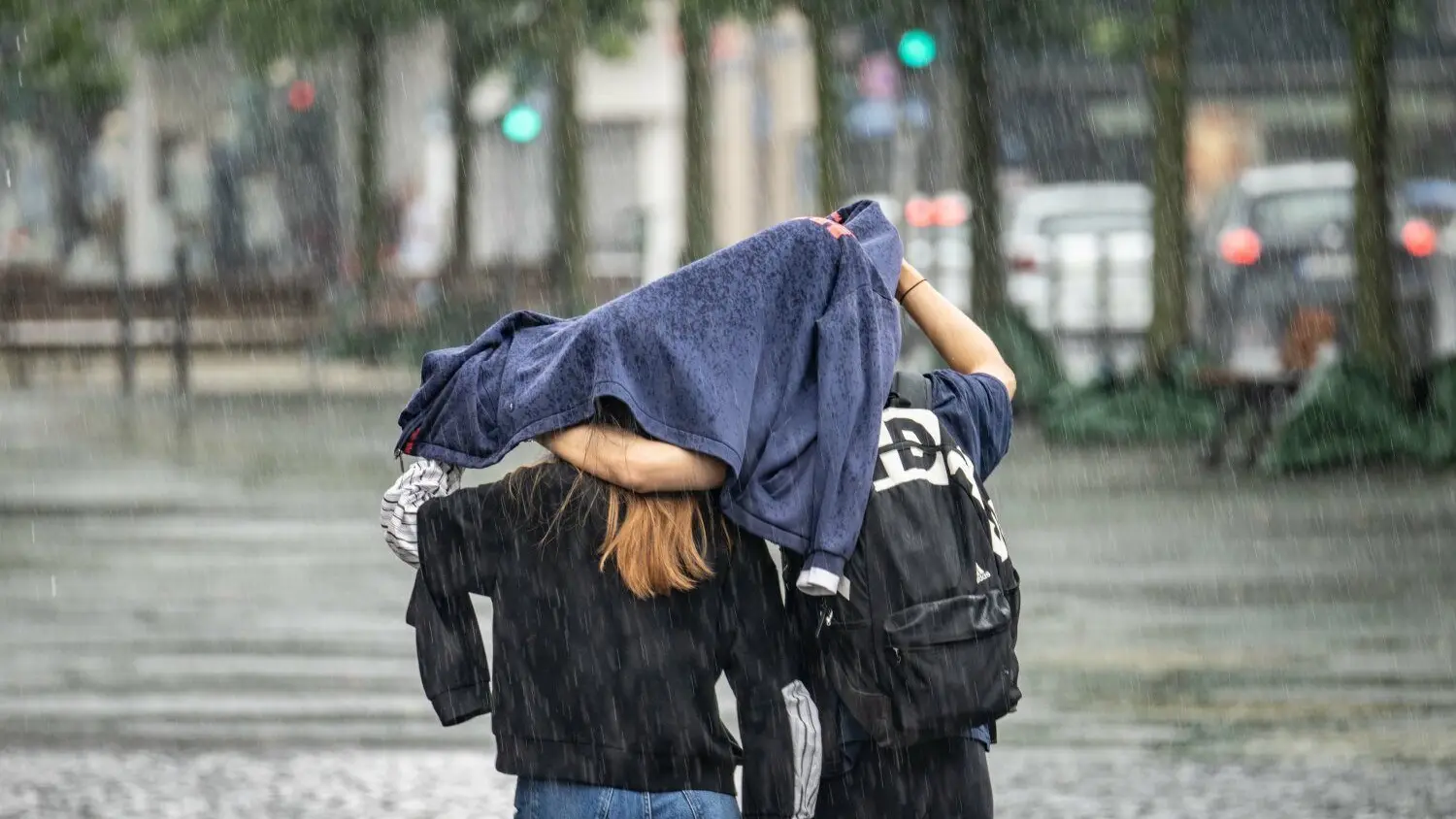 Zwei Passanten schützen sich mit einer Jacke vor einem Regenschauer in Frankfurt/Main. Am Freitag drohen in Hessen Gewitter mit starkem Regen, Hagel und Orkanböen.
