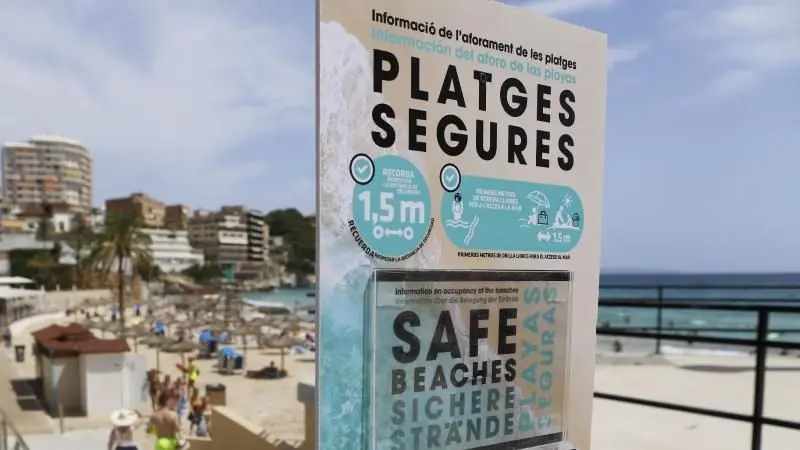 Ein Schild am Eingang zum Strand von Cala Major weist auf die Sicherheitsmaßnahmen hin, die die Verbreitung des Coronavirus verhindern sollen. Foto: Clara Margais/dpa